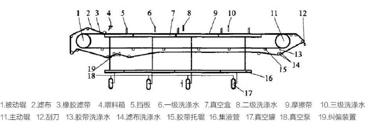 該設(shè)備采用了固定真空盒,膠帶在真空盒上滑動(dòng),真空盒與膠帶間構(gòu)成運(yùn)動(dòng)密封的結(jié)構(gòu)型式。以濾布為介質(zhì),使料漿水平布置于過(guò)濾介質(zhì)之上,充分利用料漿重力和真空吸力實(shí)現(xiàn)固液分離。它能連續(xù)自動(dòng)完成過(guò)濾、濾餅洗滌、卸渣、濾布沖洗等工藝操作,并且母液、濾餅洗滌液可以分段收集。