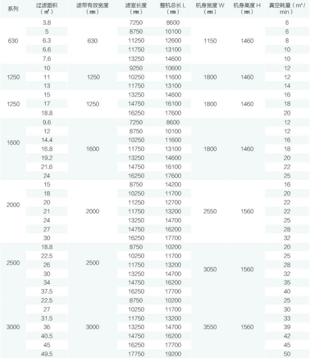 帶式真空壓濾機(jī)是以真空負(fù)壓為推動(dòng)力實(shí)現(xiàn)固液分離的設(shè)備,在結(jié)構(gòu)上,過(guò)濾區(qū)段沿水平長(zhǎng)度方向布置,可以連續(xù)完成 過(guò)濾、洗滌、吸干、濾布沖洗等作業(yè)。帶式真空壓濾機(jī)具有自動(dòng)化程度高、生產(chǎn)能力大、洗滌效果好、分離效果好、濾餅水分低、操作靈活,維修費(fèi)用 低、節(jié)能環(huán)保等優(yōu)點(diǎn)。其自動(dòng)化程度高,可實(shí)現(xiàn)連續(xù)生產(chǎn),提高了過(guò)濾效率;生產(chǎn)能力大,可滿足大規(guī)模生產(chǎn)的需求;分離效果好,能夠有效地將固體顆粒與液體分離;同時(shí),由于其采用負(fù)壓原理工作,能耗較低,對(duì)環(huán)境無(wú)污染。