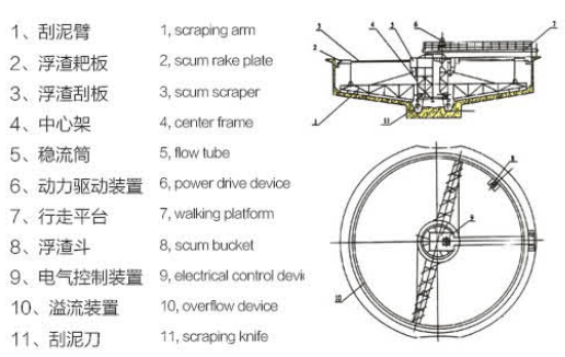 特點:該機采用中心傳動垂架式,下部采用整體對數(shù)螺線刮 板,上部設(shè)有浮渣收集裝置,池壁四周設(shè)溢流裝置及浮渣 排出裝置。該機傳動機構(gòu)為行星擺線針輪減速機與帶外齒 的大型回轉(zhuǎn)支承二級減速具有傳遞扭矩大,運轉(zhuǎn)平穩(wěn),穩(wěn) 流效果好等優(yōu)點。