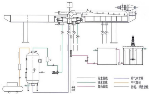 工作原理及構(gòu)造:利用溶氣系統(tǒng)向水中溶入大量的空氣,形成溶氣水,進入待處理水中,減壓釋放后在水中形成大量的微細氣泡,氣泡與水中 的雜質(zhì)、絮粒相互粘附,形成比重小于水的浮體,從而快速浮出水面,經(jīng)刮渣裝置撇除后,完成固、液兩相分離,使水質(zhì)得到 凈化。主要由池底、撇渣裝置、工作橋與行走裝置、布水布氣裝置、集水裝置、集電裝置組成。